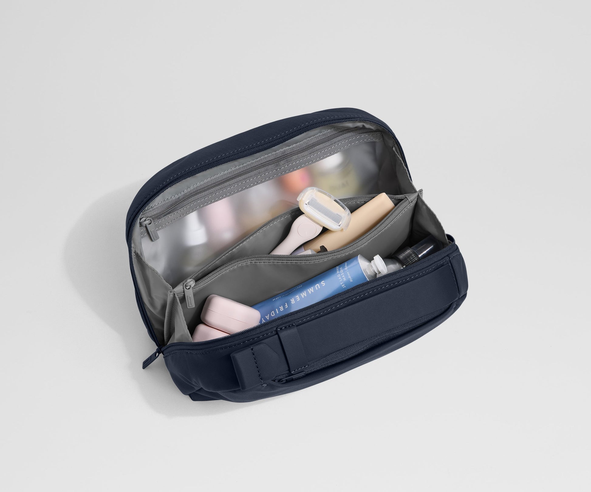 Designed to fit all of your travel essentials, and then some. With an exterior zip pocket for grab-and-go items (like disinfectant wipes or makeup remover pads), our toiletry case has multiple interior compartments to keep your products organized and at the ready.